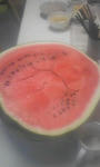 先日いただいた重さ20キロの巨大すいか、今日入刀しました。大き過ぎて冷蔵庫や川で冷やす事もできません。