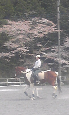 馬場のまわりの桜は終わって緑の葉が芽吹いて来ました。山桜はこれからなので、山々は所々がピンク色できれいです。