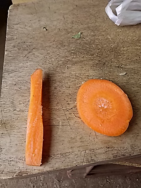 この人参の切り方ですが、再三言っていると思いますが、丸く切るのはやめましょう。誤飲した場合、丸いと気管の入り口に蓋をして窒息する可能性があります。滅多に無い事ですが全く無い事ではありません。そして細く切ると誤飲の可能性も減ります。